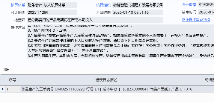 通过核算单据查询找到负金额。然后找到对应工单行号。存货核算异常,原因是返工单没按实际数量退返还件。返工60个成品,退了6000个子项物料。成本异常。正确做法是要分3行退返还件。第一行40*6=240 第二行900*6=5400 第三行60*6=360 总数量6000个子项 核算单据查询维护退料成本为-0.01第二种问题 是期初在产负金额,上期做了很多退料,使用期初在产品成本调整