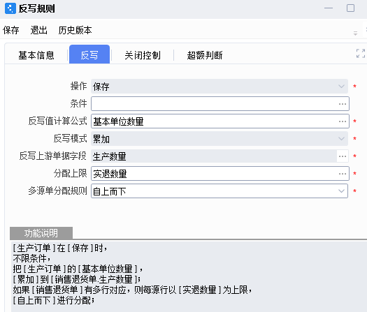 简介同一个客户销售退货单多行相同物料的时候,下推生产订单同物料的数量合并下推成一行生产订单数量合并考虑到多次下推情况,所以使用公式计算,每次下推数量会扣除上次已经下推的数量实现效果如下图:2行数量下推合并成一行105。