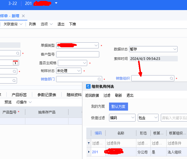 根据当前组织来判断可以选到的销售组织。当当前组织是100的时候可以过滤出来 100与201 组织 ,当当前组织是201的时候只能过滤出来201组织