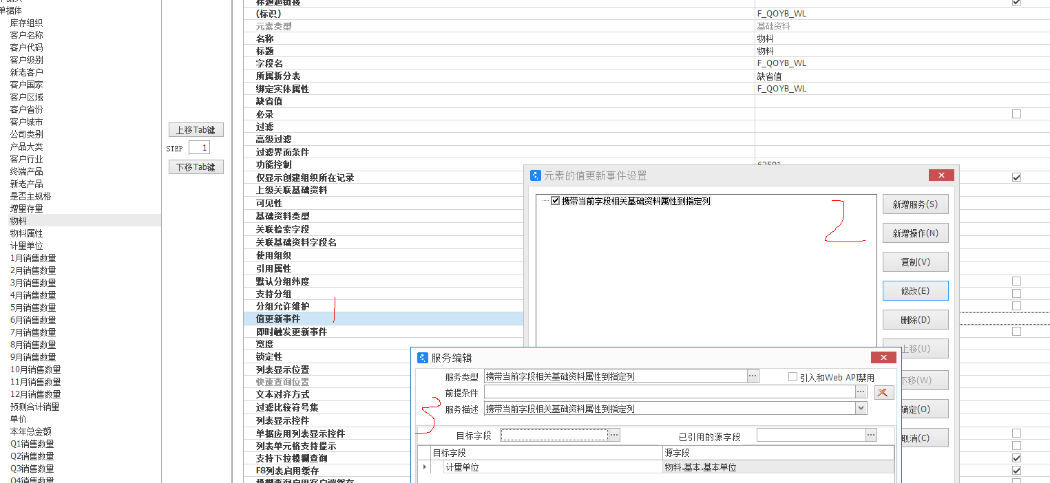 BOS二开单据根据每月销售数量计算本年的销售数量合计。在每月销售数量字段上做如下配置。每个月都用一用的公式。保证每个月数值反生改变时,都可以自动更新合销售数量合计。注意销售数量合计字段 即时触发更新事件...金蝶ERP云星空物料编码加客户名称唯一性检查