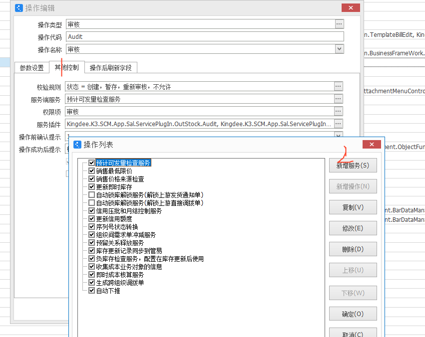 销售订单审核后,自动下推其他入库单。并且其他入库单自动提交审核。第一步,新增销售出库到其他入库的单据转换。步骤省略第二步在 销售出库单的审核按钮上,其他控制-服务端服务-新增自动下推服务,第三步需要增加反写规则,避免重复下推。销售出库单到其他入库单在销售出库单新增一个数量自动。承载反写的数量。第四步自动提交审核其他入库单插件增加【复选框】字段(字段标识:F_PATC_CheckBox),自动审核,