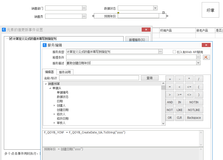 创建一个整数字段或者文本字段,预测年份。设置预测年份值更新事件。截取创建日期的年份。并且在表单属性的菜单集合,选择保存按钮,调用值更新服务。