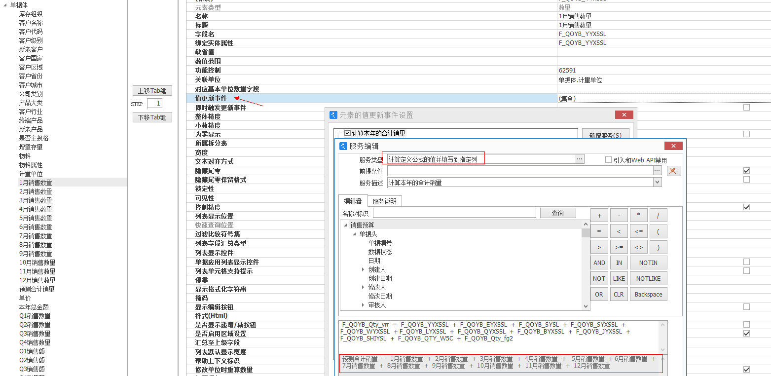 BOS二开单据根据每月销售数量计算本年的销售数量合计。在每月销售数量字段上做如下配置。每个月都用一用的公式。保证每个月数值反生改变时,都可以自动更新合销售数量合计。注意销售数量合计字段 即时触发更新事件 需打钩