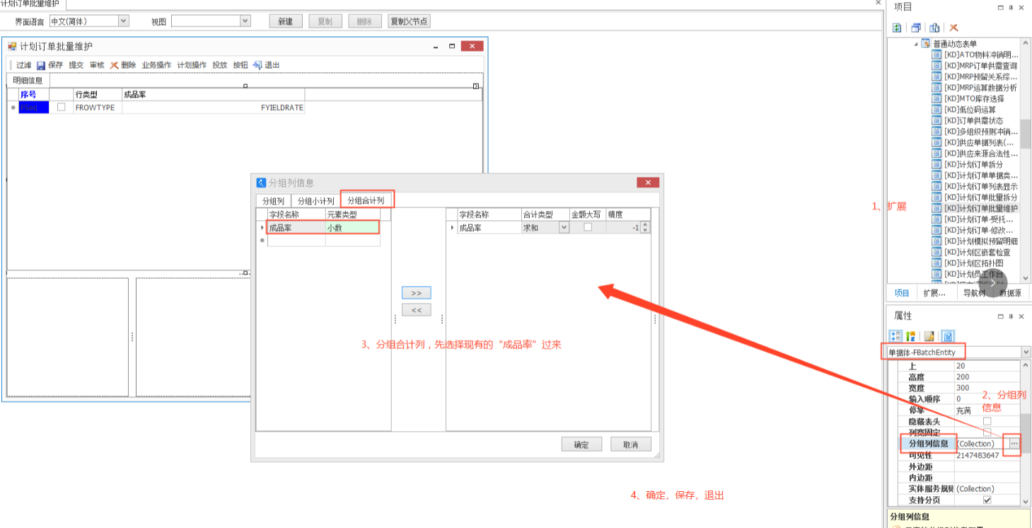 由于这个是动态表单跟普通表单不一样直接能汇总。1、BOS-生产制造-计划管理-计划订单批量维护,扩展,单据体上,分组列信息,分组合计列,选择系统中默认的“成品率”确定,保存,并关闭掉计划订单批量维护界面。2、BOS中,光标定位在计划订单批量维护扩展的节点,点击“打开增量Xml”,将如图中字段标识换成需要合计的计划订单字段标识,保存,关闭。若要多个字段合计,把如图中红框复制出来粘贴进去,换成需要的字