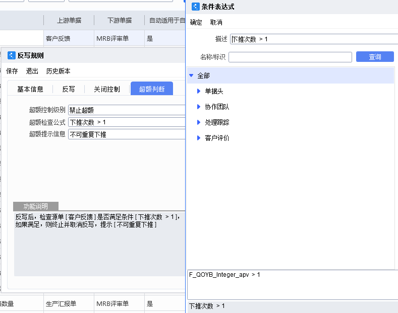 上下游单据分别都增加一个整数字段,命名:下推次数。单据反写规则添加如下: