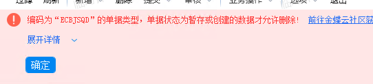 简介首先把产生的业务数据删掉,再反审核单据类型。结果发现删除不了去数据库把这个单据类型 状态改为 暂存或者创建 在BOS中可以看到单据类型这个表状态列表对应的值 改为 Z 或者 AselectFDOCUMENTSTATUSfromT_BAS_BILLTYPEwhereFNUMBER='ECBJSQD'updateT_BAS_BILLTYPEsetFDOCUMENTSTATUS='