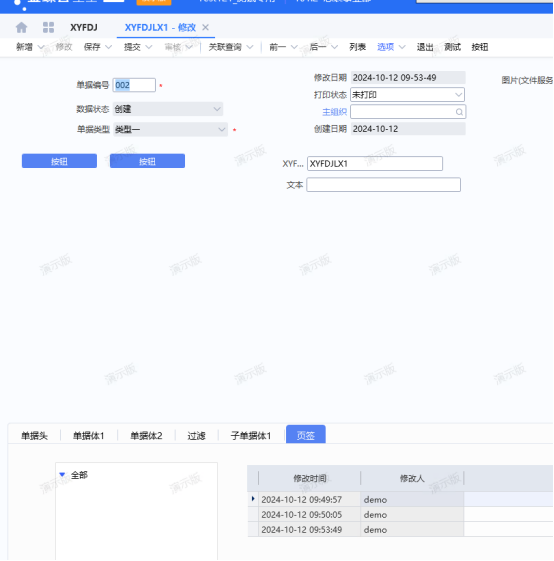 1、新增单据体-修改记录,设置不可复制