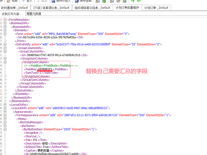 2、BOS中,光标定位在计划订单批量维护扩展的节点,点击“打开增量Xml”,将如图中字段标识换成需要合计的计划订单字段标识,保存,关闭。